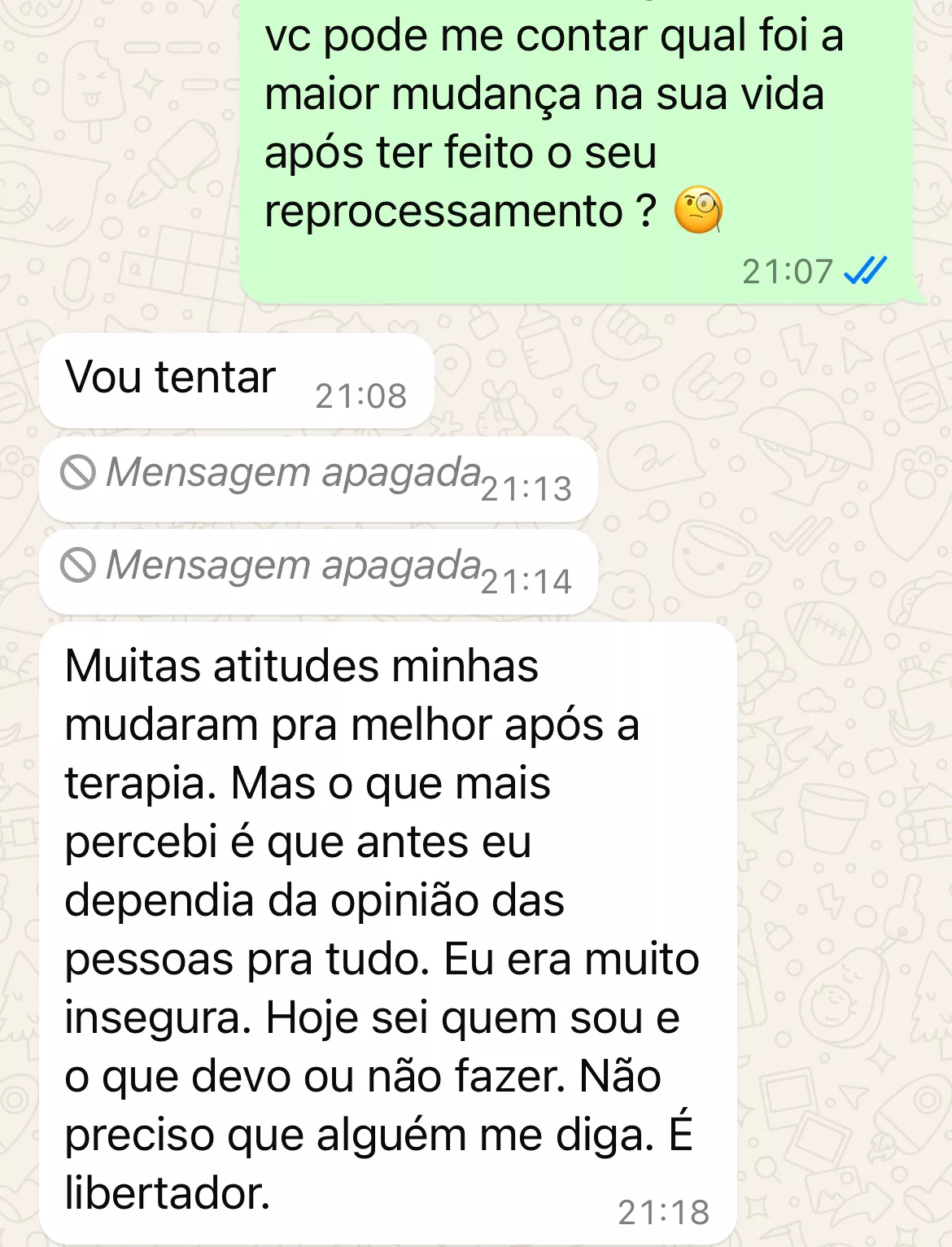 Em um certo momento da minha carreira, decidi mergulhar de vez no mundo da saúde mental. Me formei pelo Instituto Brasileiro de Formação de Terapeutas (IBFT), em Terapia de Reprocessamento Generativo, a mais avançada e moderna metodologia para tratar problemas emocionais graves, garantindo resultados rápidos e permanentes.